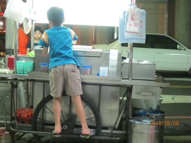 - 店家第三代小毛頭個子小須墊腳站在攤車 上 人小鬼大的幫倒忙 嘴巴唸唸有詞賣完了要收攤囉