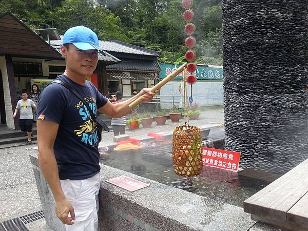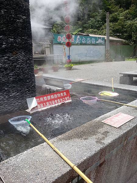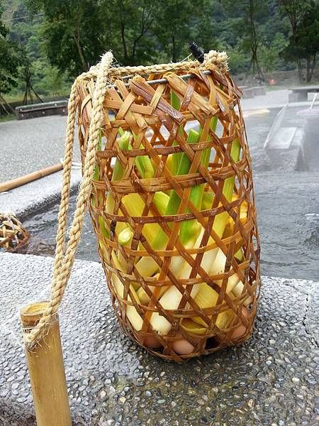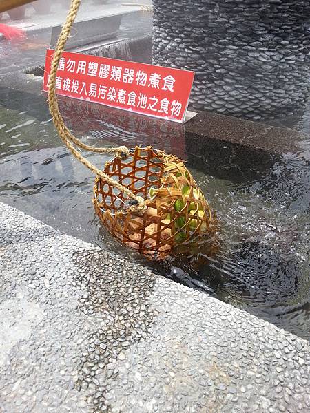 跟服務站租借一個竹籠來裝食物下去溫泉池裡煮食