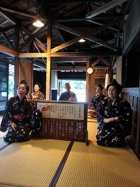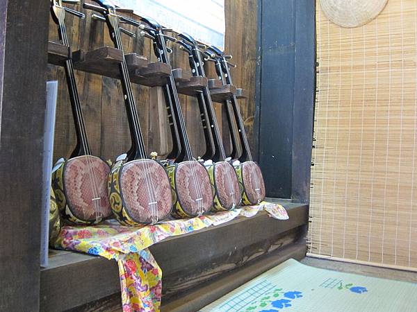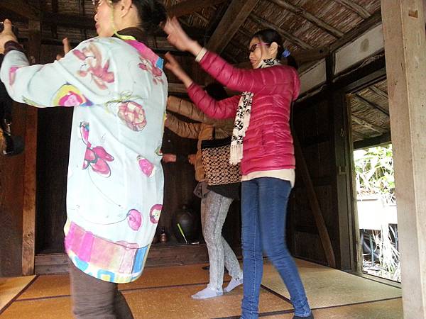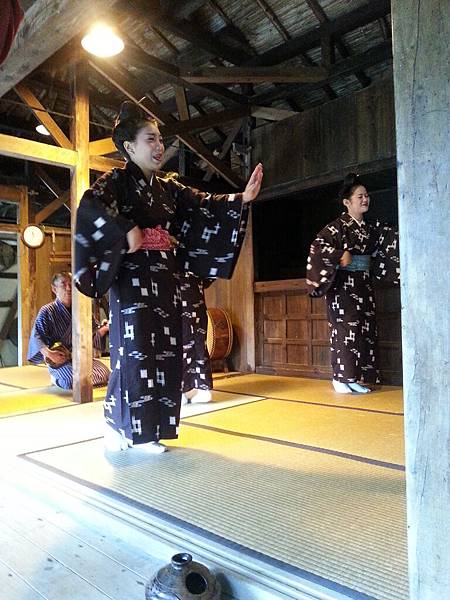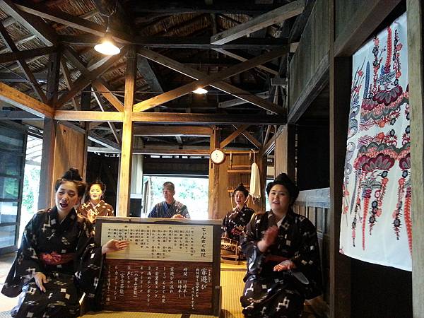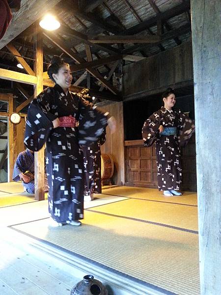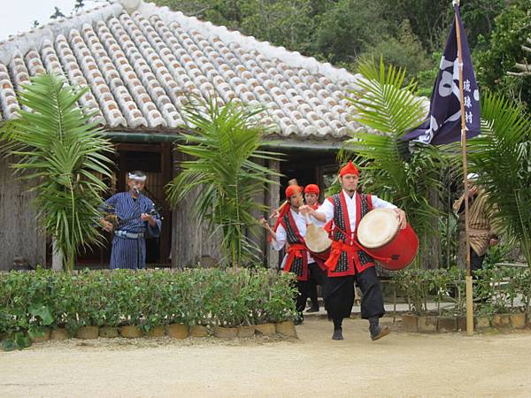 村裡的建築物是真真正正的古蹟搭配扮成村民的服務人員隨著沖繩傳統樂器音樂聲熱切互動